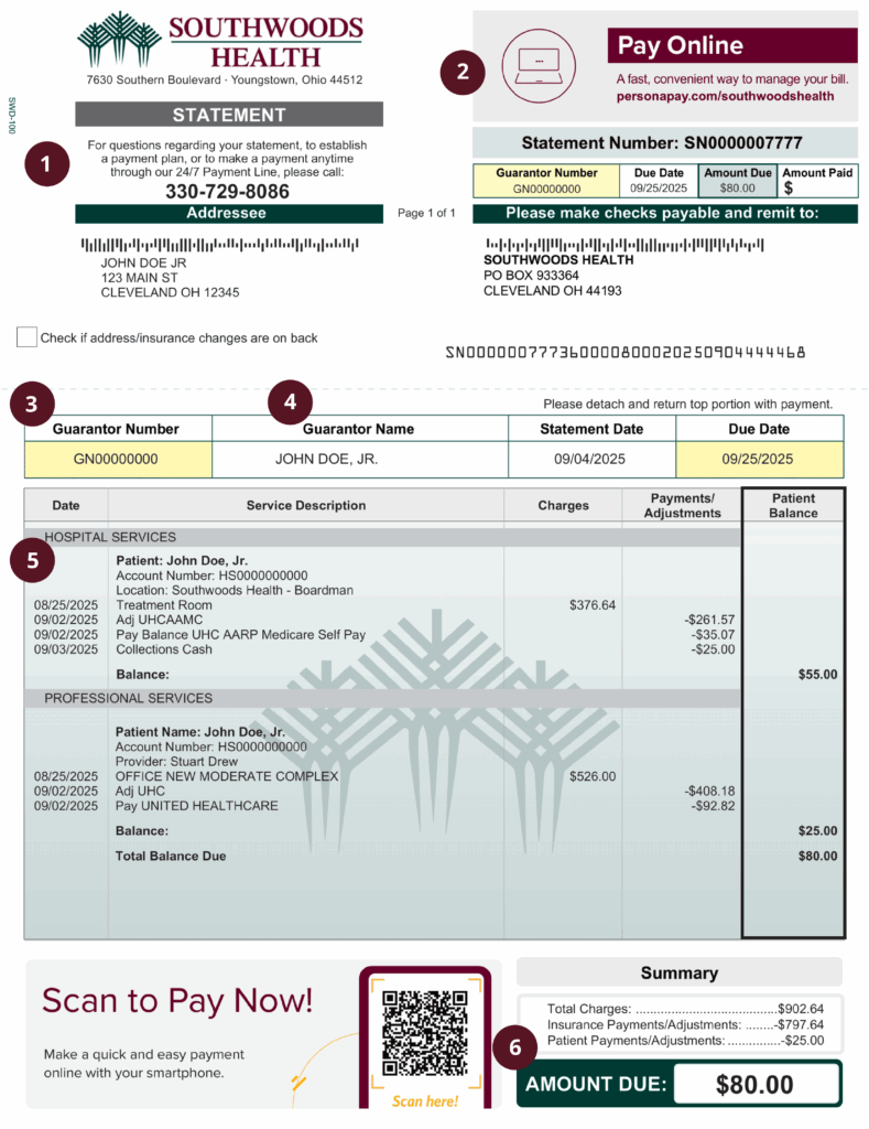 At Southwoods Health, we are devoted to finding new and innovative ways to perfect the patient experience. Based on feedback received from our patients, we are providing a consolidated statement for all of your hospital and physician services. We hope you like our new look!